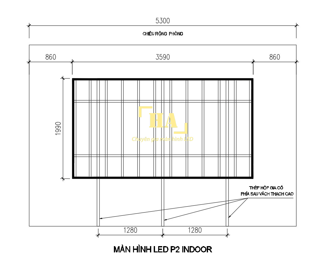 - Do đặc điểm phía sau màn hình là vách thạch cao không có khả năng chịu lực, sau khi nghiên cứu và tính toán chi tiết Màn hình led HA chúng tôi đã đưa ra phương án gia cố đảm bảo kết cấu khung màn hình vững chắc và đạt hiệu quả thẩm mỹ cao.